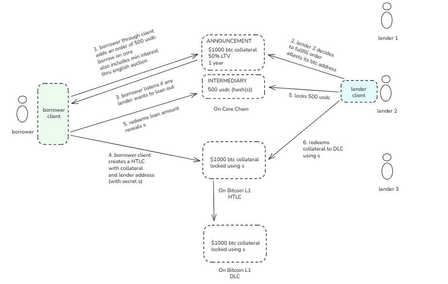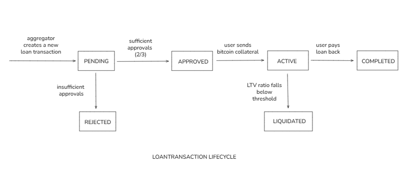 Lender is responsible for creating new DLCs on the Bitcoin L1 and adding new loan transactions to the Core Smart Contracts. Other operators are required to approve a transaction before a loan can be initiated. Once a supermajority of operators approve the transaction, a loan can be initiated. Once a user sends the bitcoin collateral to the contract, the loan is marked active. Finally, when the user returns the loan + interest, the loan is marked completed.